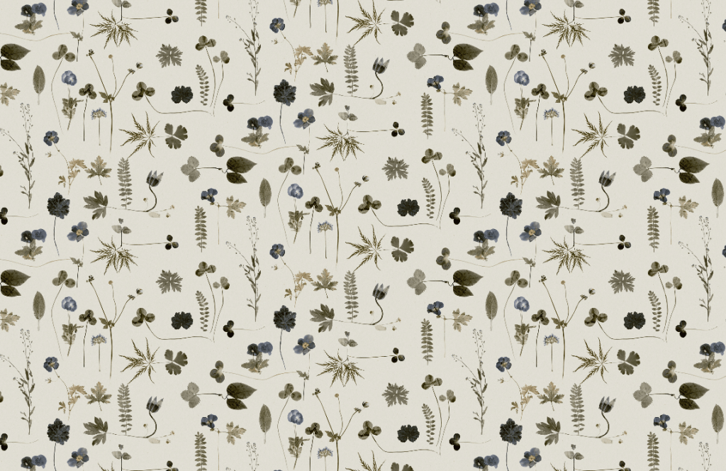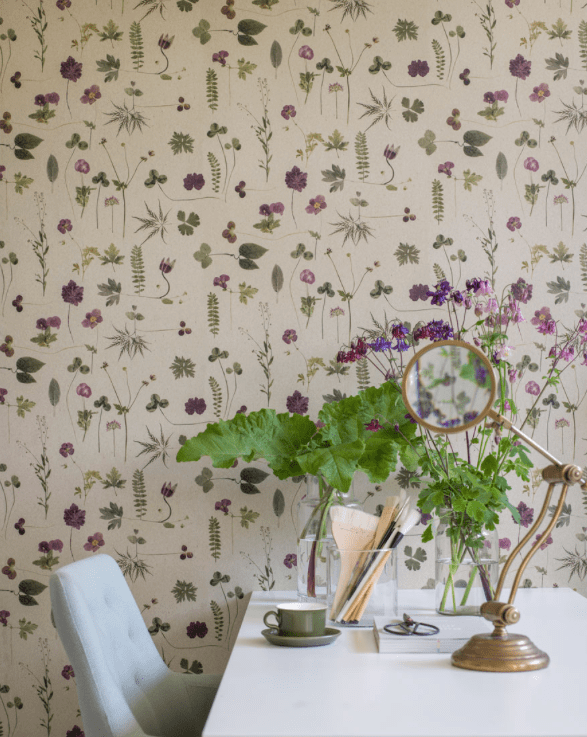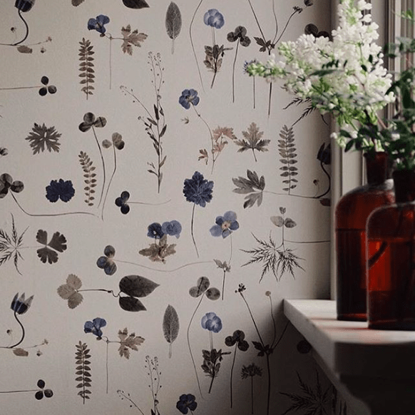 Hay dos opciones, fondo blanco o beige con flores en tonos azules o más rosáceos cuyo matiz se aprecia sobre todo en las flores. Un cuidado diseño de Emma von Brömmsen que logra este acabado trabajando con flores secas, por ello este papel tiene un efecto tan realista, es como tener flores secas prensadas en nuestra pared, una delicia de trabajo.